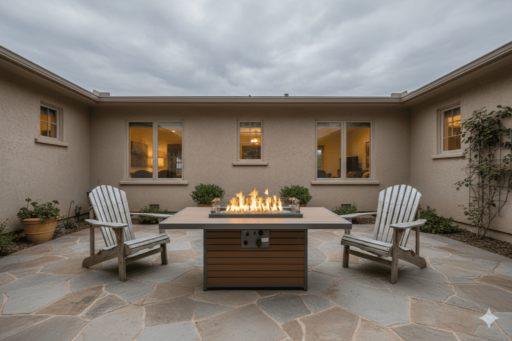 The Outdoor GreatRoom Company makes the Kenwood 50″ x 31″ Rectangular Firepit Table which has a composite deck top and base brings a modern, warm look to your outdoor room. Admire the easy-to-care-for design as you relax or entertain guests. The unique elevated 12” x 24” Crystal Fire® Plus burner is UL listed for safety and will dazzle guests.