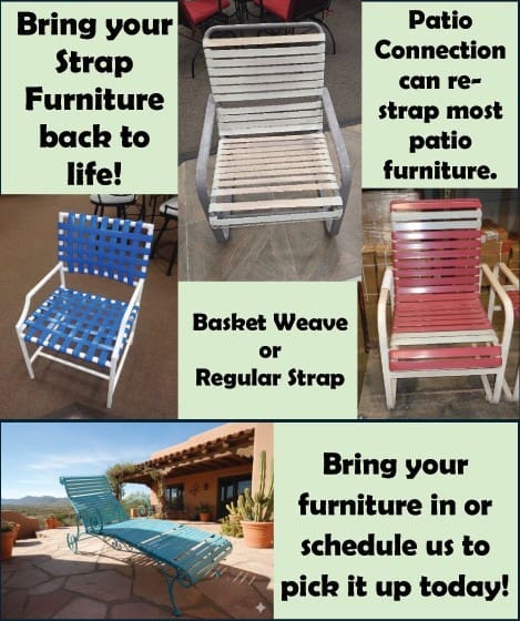 If your frames are still in good shape and ready for more years of use then most vinyl straps can be replaced. Patio Connection can replace regular or cross straps (Tami Ami are one of the strap styles we can’t replace) on most frames, the process takes usually 3 to 4 weeks and possibly more with the busy season. If you are not sure if your furniture can be be re-strapped, send a picture of the front and back to our email patioconnection@outlook.com or text a picture to 520-293-5110 and we can tell you if it can be replaced. Either you can bring your strap furniture to Patio Connection or we can pick it up and redeliver for a charge, let us know if you want the whole frame re-strapped or if you just need a few straps replaced. Then simply Pick your color and we call you when it is ready. Pricing can very depending on size of the vinyl strap, regular or cross strapped configuration.